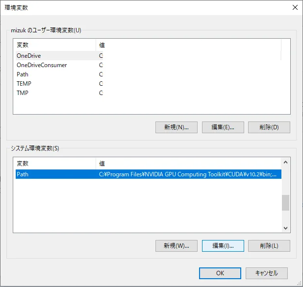 システム環境変数の方の「Path」を選んで「編集」を押下します。