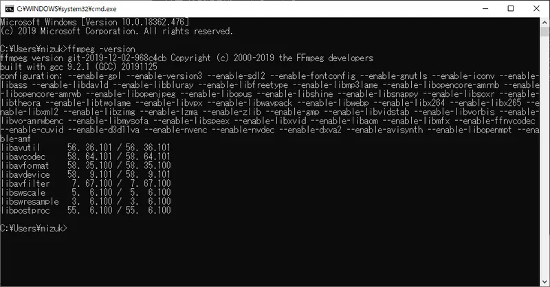 コマンドプロンプトに「ffmpeg -version」と入力して