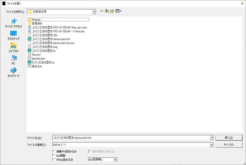 ファイルの種類を「AllFile」に変更して、「m2v」ファイルを開きます。