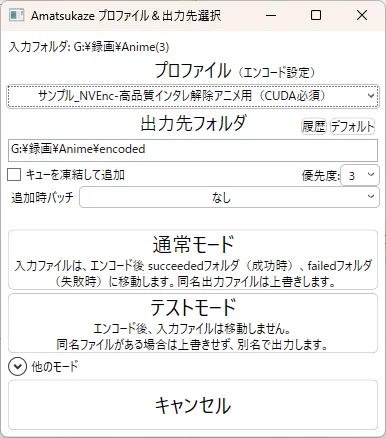 プロファイル、出力先フォルダを指定したら