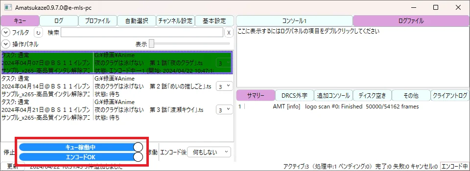 『キュー待機中』『エンコードOK』の箇所を
