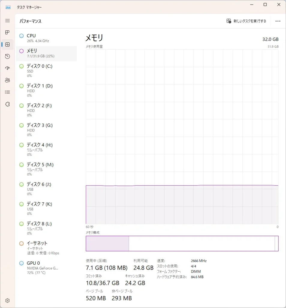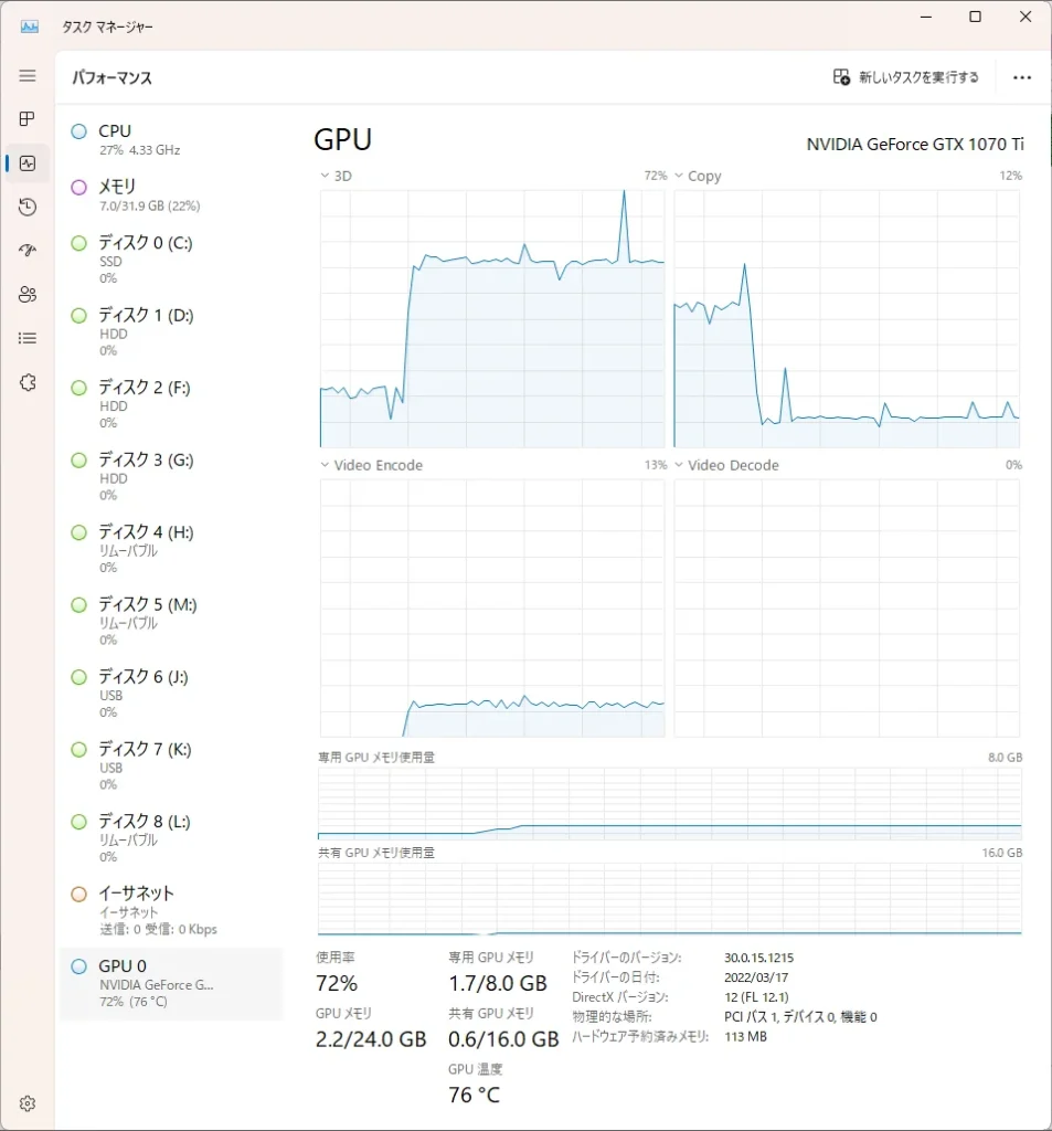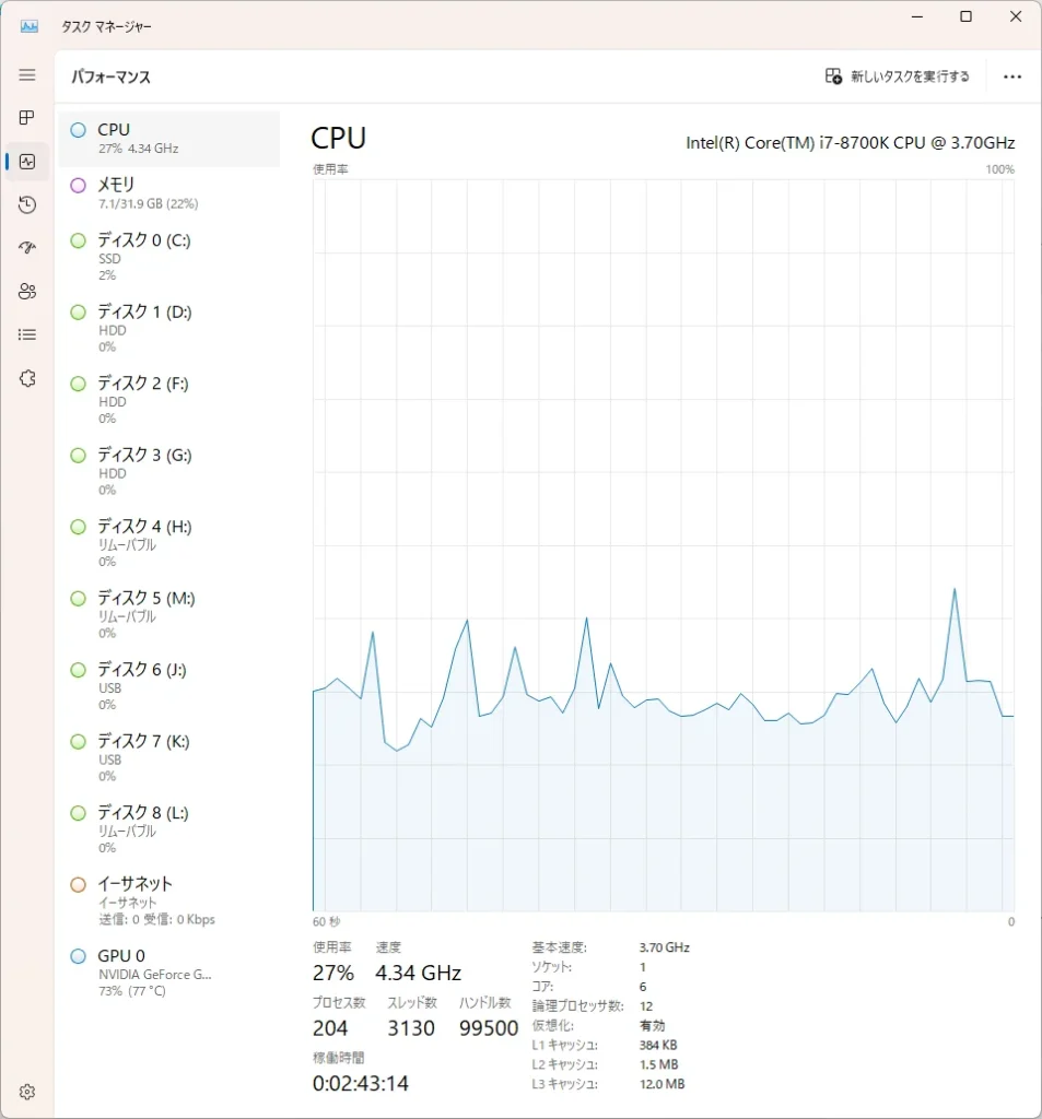 ちなみに私の環境だとCPU使用率が平均27%ぐらいでした…。